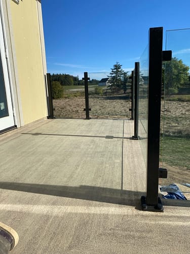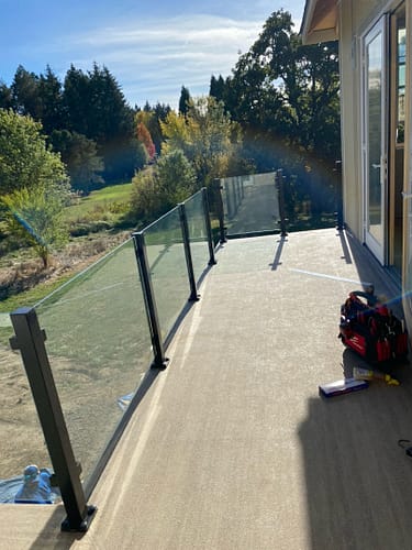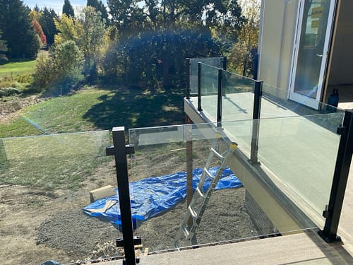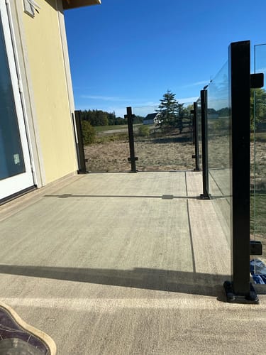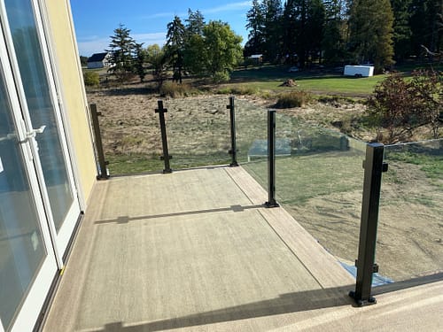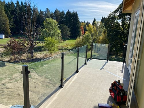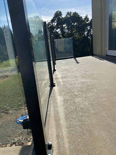 To complete the deck, we installed a glass railing system. The posts are powder-coated aluminum, and the panels are tempered safety glass. The system was surface-mounted directly onto the finished membrane using specialized flashing brackets to maintain waterproof integrity.